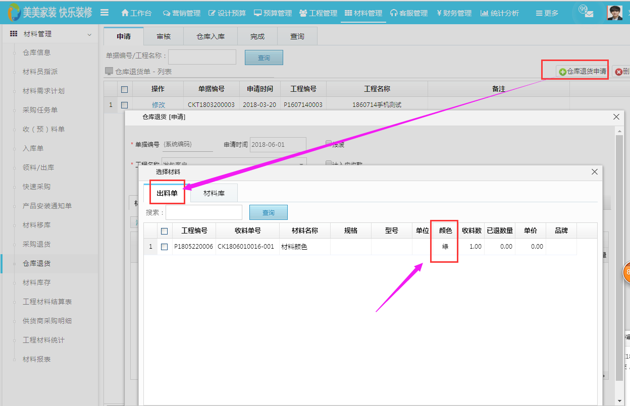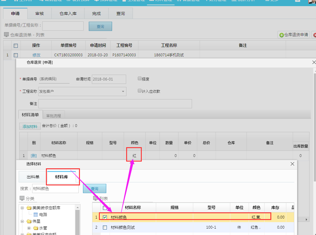 倉(cāng)庫(kù)退貨單選選材料顯示顏色區(qū)別如下: