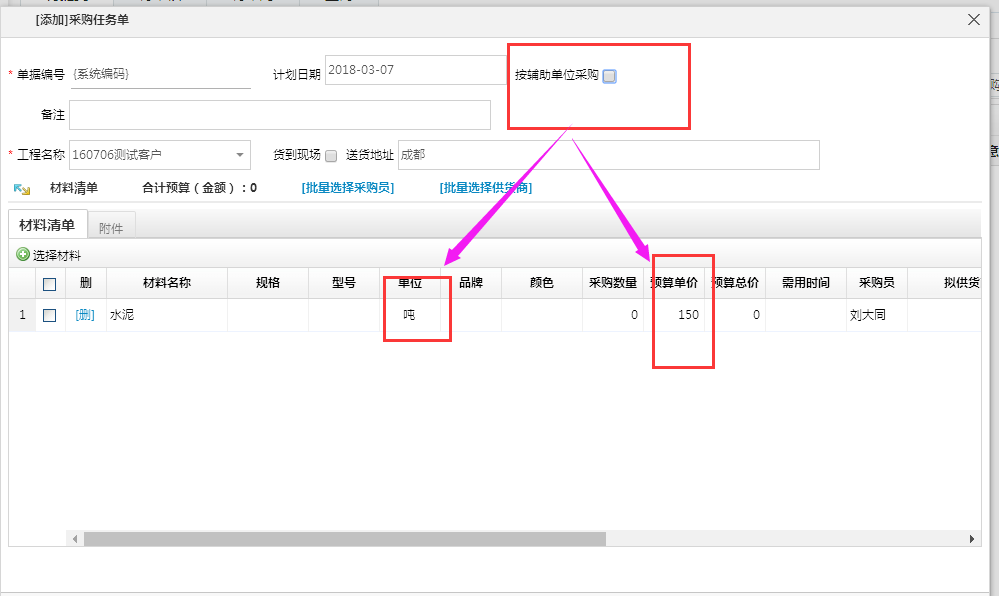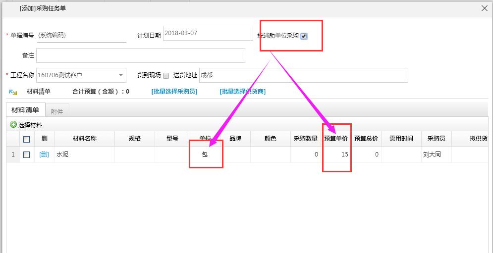 裝修公司在做材料采購時(shí)可能會采購大批量的材料,但是就具體某個(gè)工程來說所需的材料只是少量的需求,這樣就產(chǎn)生了價(jià)格偏差,為解決此類問題,美佳ERP技術(shù)部近期開發(fā)增加輔助單位,例如:公司一次性采購水泥 1 噸,報(bào)價(jià)為150元/噸,某個(gè)工程所需水泥1包,那么系統(tǒng)自動將價(jià)格調(diào)整為15元/包。