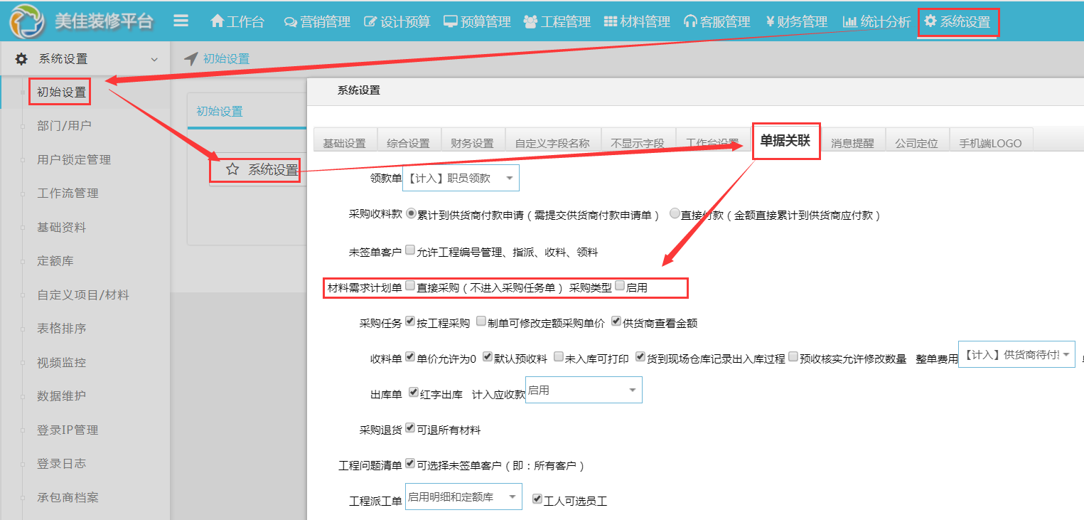 依次點(diǎn)擊系統(tǒng)設(shè)置---初始設(shè)置--系統(tǒng)設(shè)置---單據(jù)關(guān)聯(lián)【取消直接采購(gòu)(不進(jìn)入采購(gòu)任務(wù)單)】