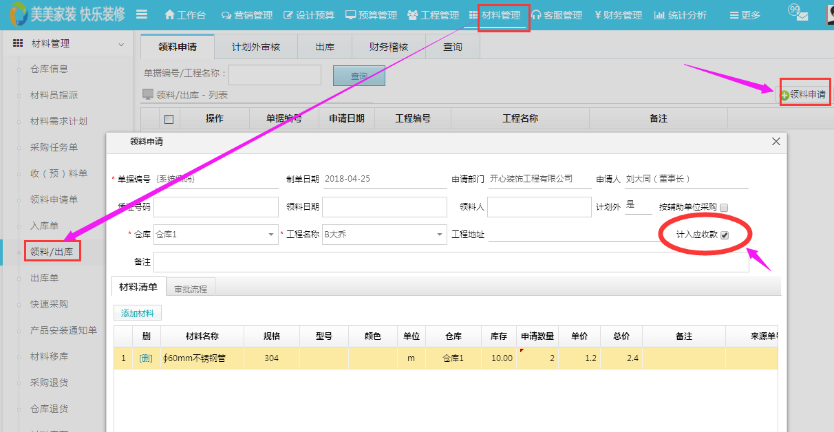 我們在做領(lǐng)料/出庫單的時候如果此材料是臨時采購并需要計入客戶收款中時請注意勾選“計入應(yīng)收款”