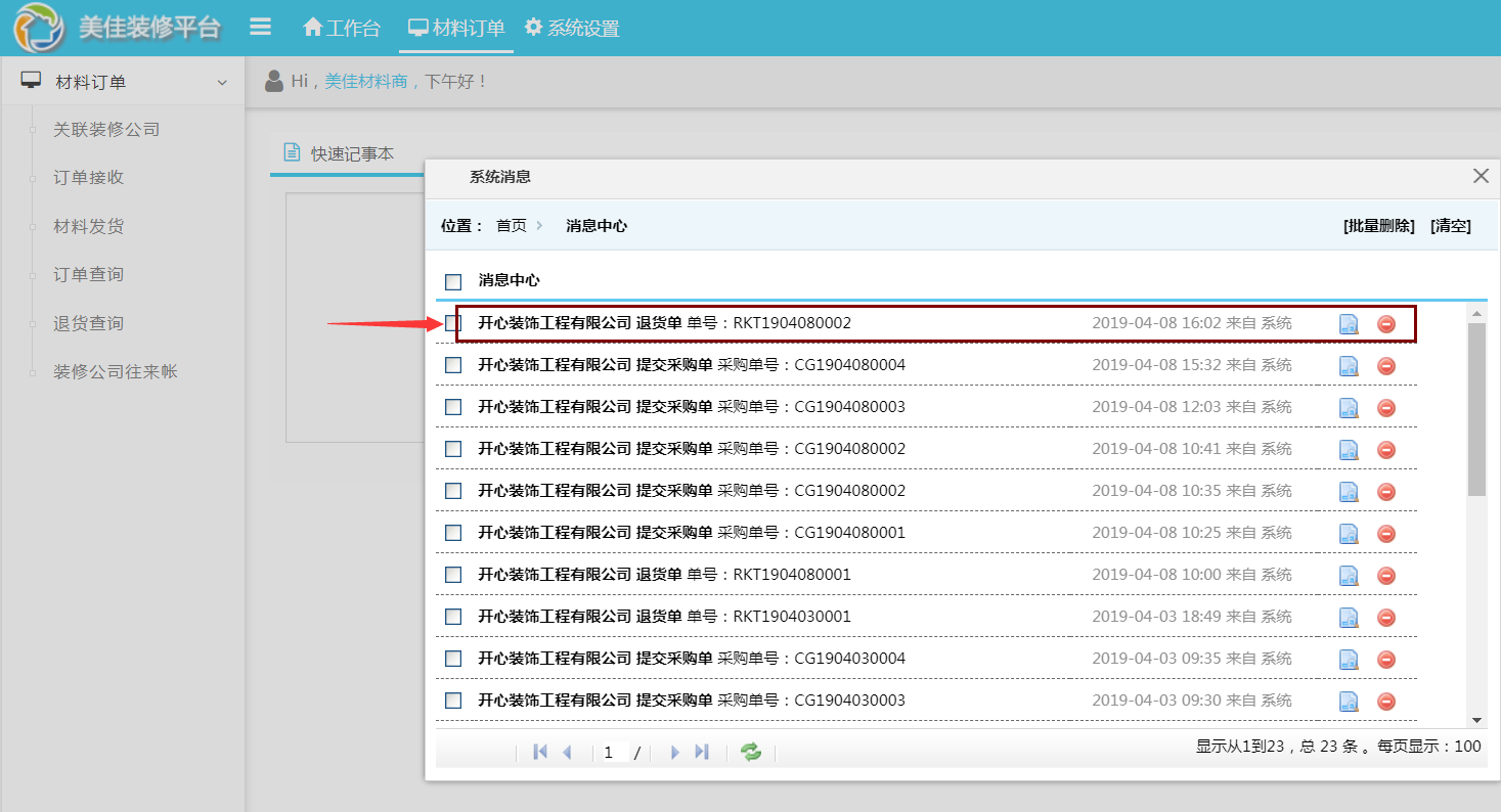 材料商于一體的信息化管理平臺(tái),不斷在完善各種功能,滿(mǎn)足裝修公司的所有個(gè)性化需求,近期新增材料商退貨查詢(xún)、退貨消息通知。以達(dá)到材料商與裝修公司的溝通零等待,避免錯(cuò)漏信息。