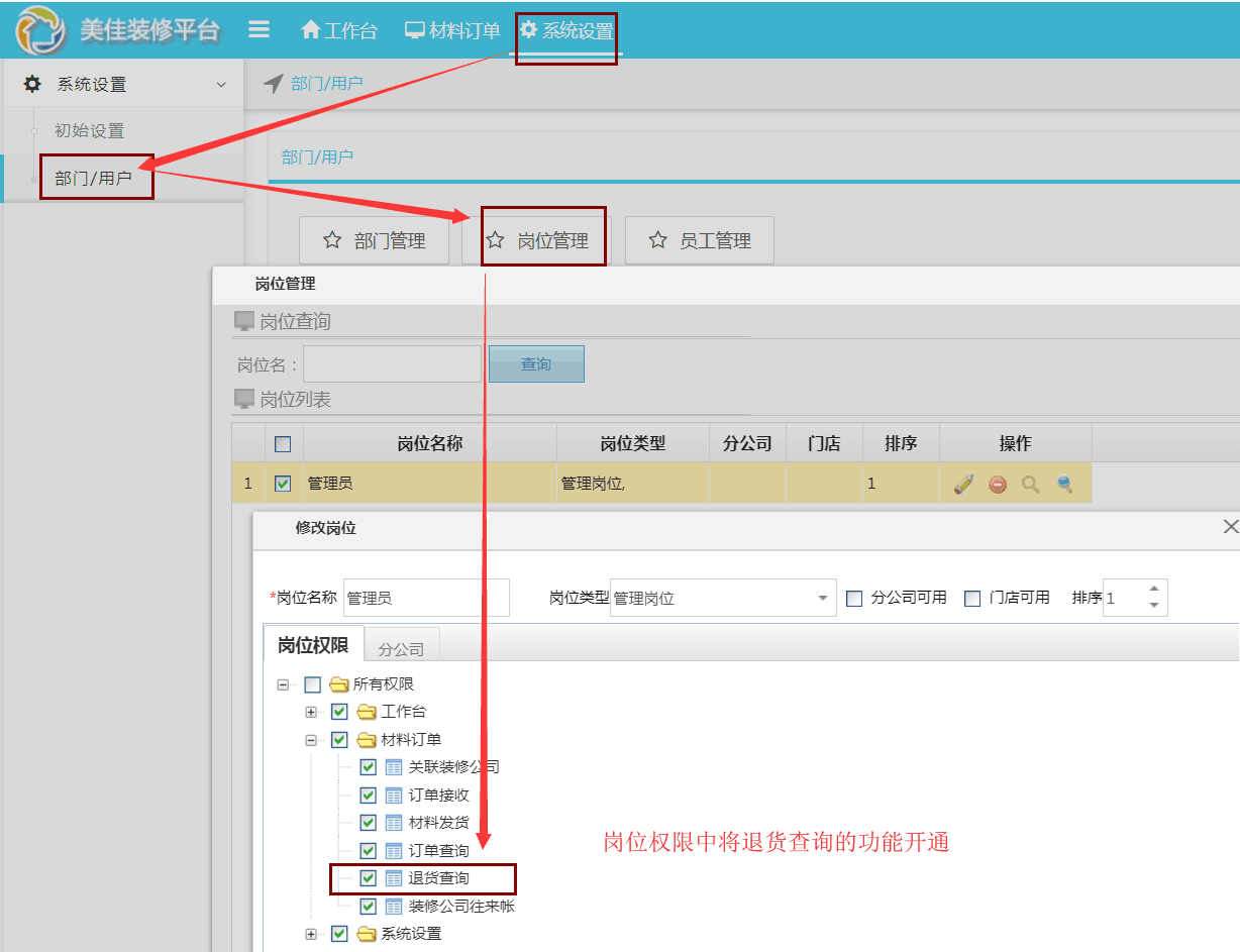 1、首先在【系統(tǒng)設(shè)置】—【部門(mén)/用戶(hù)】—【崗位管理】中勾選退貨查詢(xún)的選項(xiàng),打開(kāi)崗位此項(xiàng)權(quán)限之后該崗位就能接收到通知。