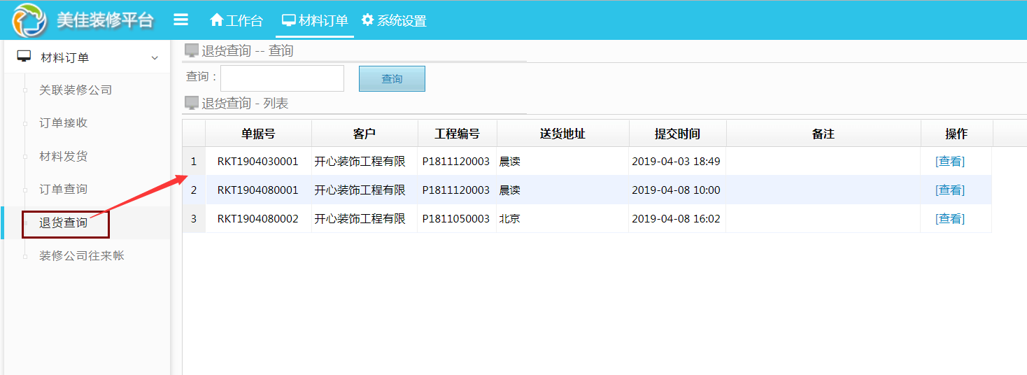 依次進(jìn)入材料商的材料訂單—退貨查詢(xún)—查看(選擇對(duì)應(yīng)的客戶(hù)退貨單)