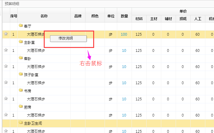 2、進(jìn)入【設(shè)計(jì)預(yù)算】---選擇一個(gè)做好的工程預(yù)算鼠標(biāo)右擊一個(gè)項(xiàng)目即可進(jìn)行說明修改。