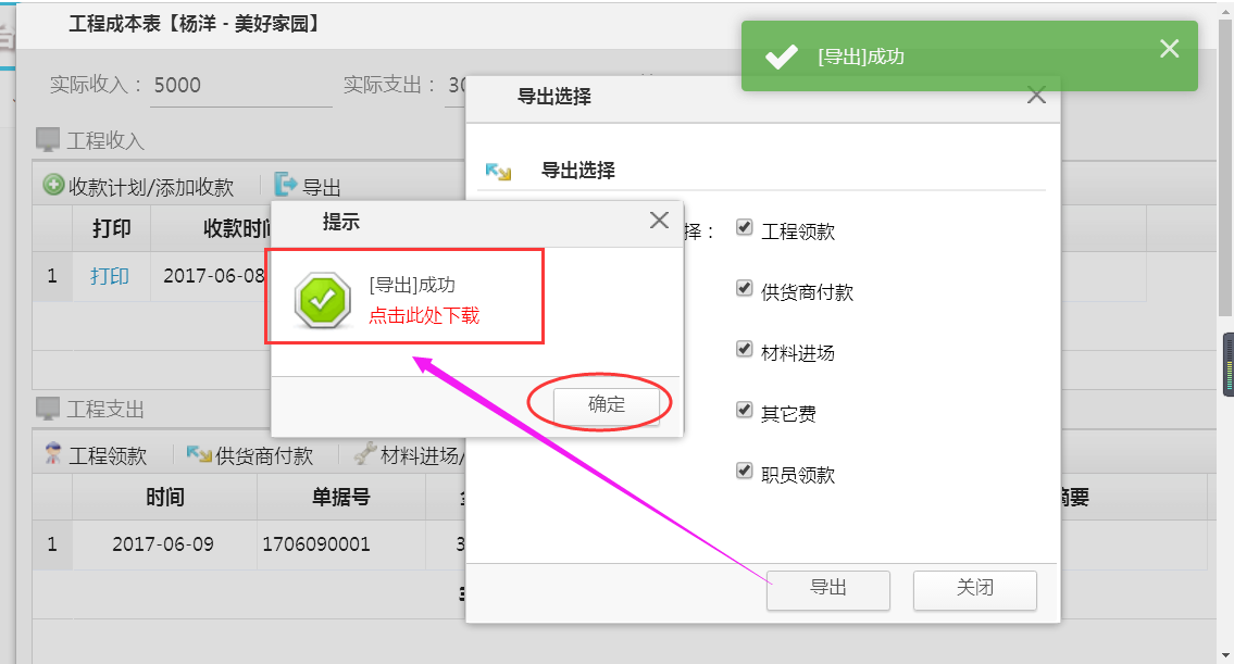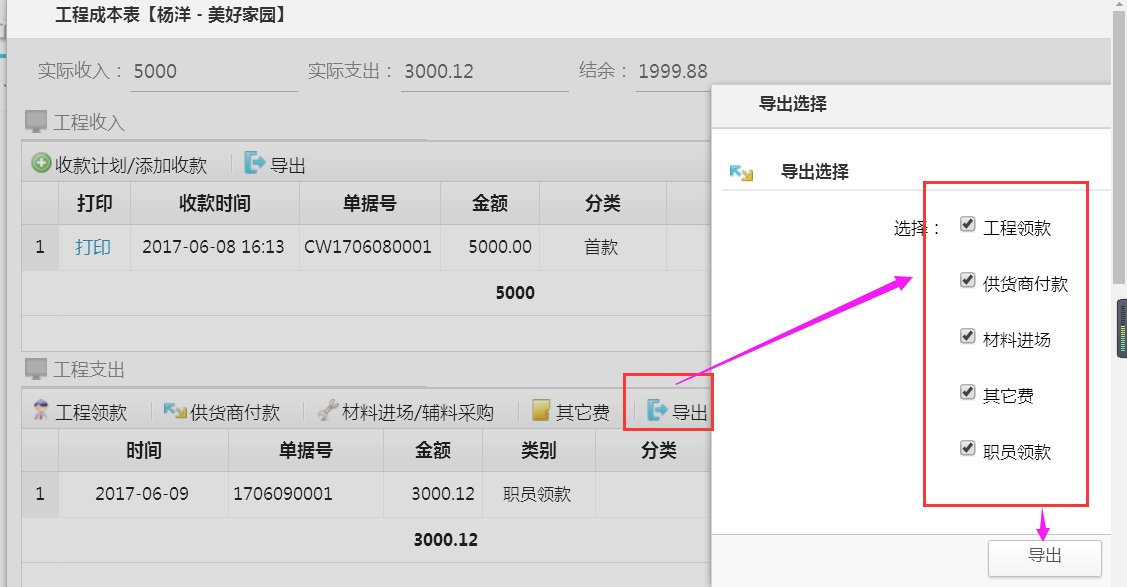 2:打開工程成本表您可在工程支出中點(diǎn)擊導(dǎo)出按鈕,將您需要導(dǎo)出的項(xiàng)目勾選好即刻導(dǎo)出