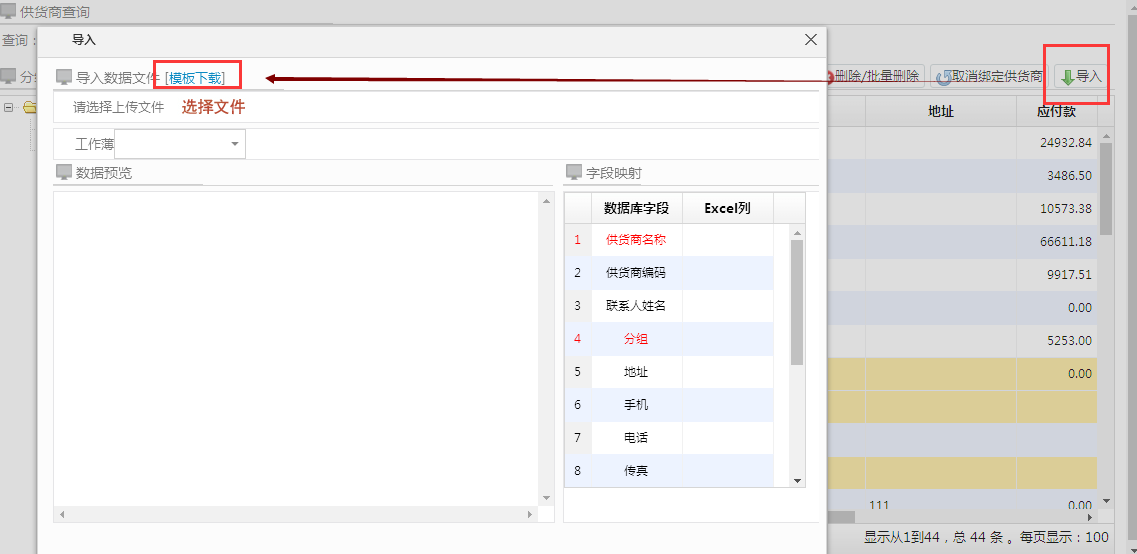 點擊【導入】可在模板中填寫供應商的具體信息,這樣就不用單個添加供應商的信息實現(xiàn)快速綁定