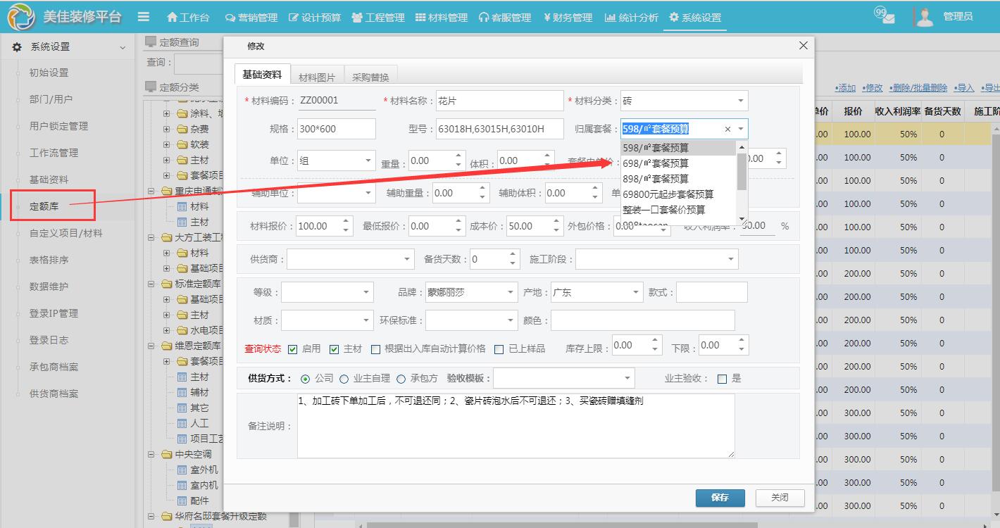 補(bǔ)充:客戶預(yù)算選擇的套系是598元/平,其中某材料要升級(jí),不管是從598元/升級(jí)為698元/平,還是升級(jí)為598元/平,系統(tǒng)都會(huì)自動(dòng)計(jì)算差價(jià)。