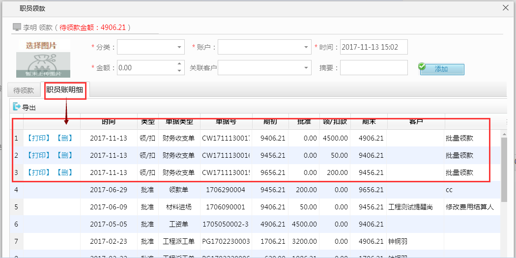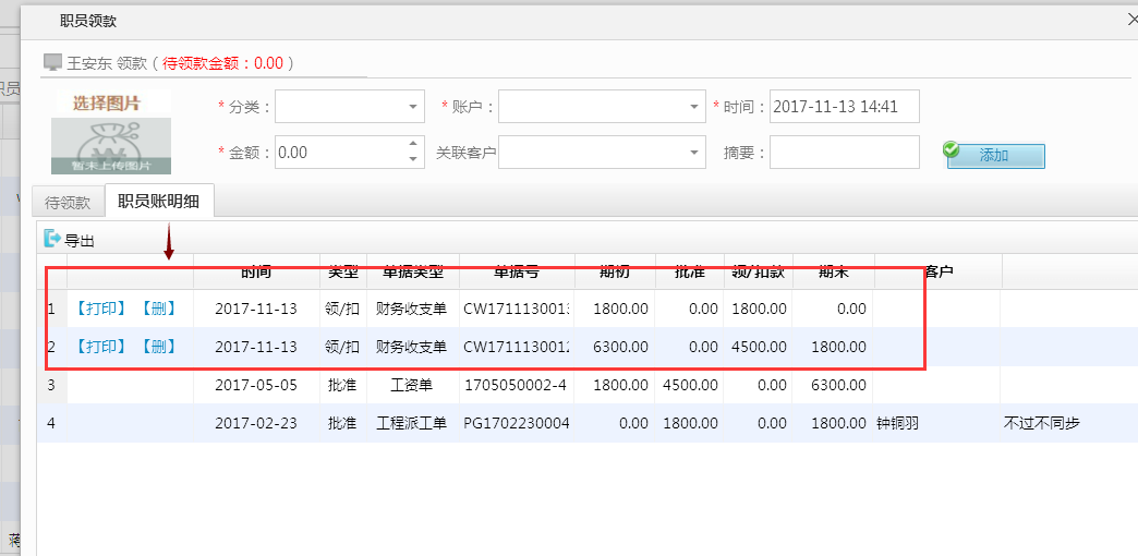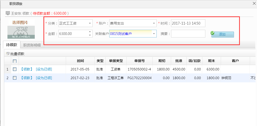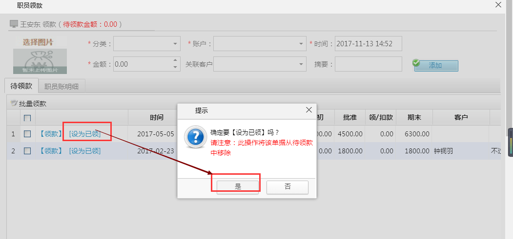 1、可直接在職員領(lǐng)款將所有的領(lǐng)款金額整合成一張單據(jù)進(jìn)行領(lǐng)款(備注:此項功能不關(guān)聯(lián)到代領(lǐng)款的單據(jù)即在待領(lǐng)款下方仍會顯示待領(lǐng)款的選項,此刻只需點擊【設(shè)為已領(lǐng)】此操作將該單據(jù)從待領(lǐng)款中移除)