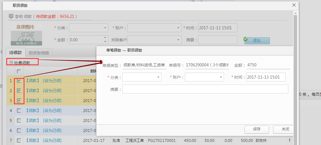 2、直接在批量領(lǐng)款中選擇相關(guān)的款項進(jìn)行領(lǐng)款,即可批量完成領(lǐng)款并可在領(lǐng)款明細(xì)中查詢到相關(guān)單據(jù)