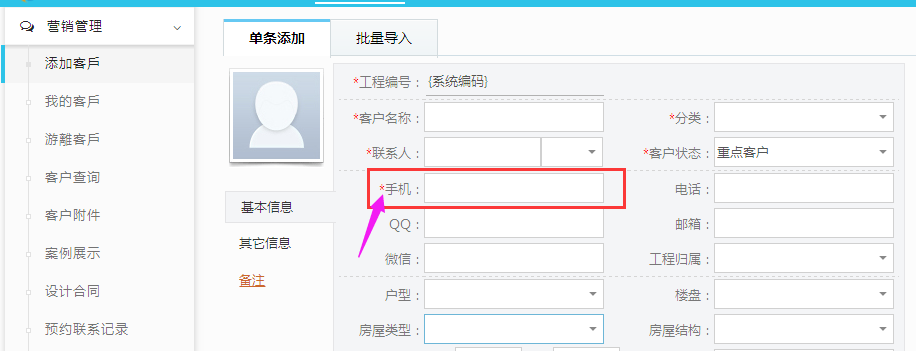 必填:在錄入客戶資料時(shí)手機(jī)號(hào)碼為必填項(xiàng),如若未填此客戶無法錄入系統(tǒng)(顯示紅色*)