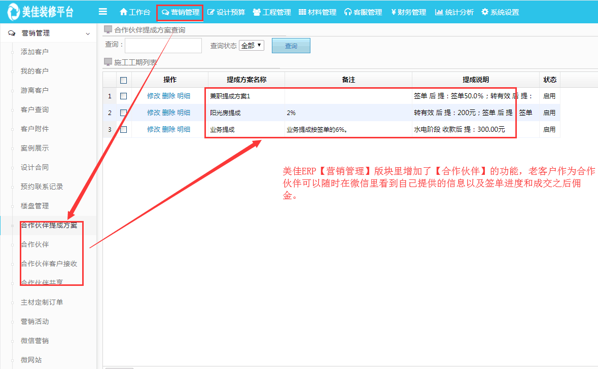 客戶帶客戶是既省時間簽單成功率又高的銷售途徑。想要回單就要把老客戶轉(zhuǎn)化為我們的合作伙伴。美佳云裝通過掃描二維碼對接微信是透明便捷的合作平臺,大大的促進客戶作為合作伙伴來向我們提供信息,與老客戶保持了粘度;也很大程度上杜絕合作伙伴的后顧之憂,比如把信息介紹給我們有沒有簽單成交,簽單金額是多少,自己能拿到多少傭金等等。
