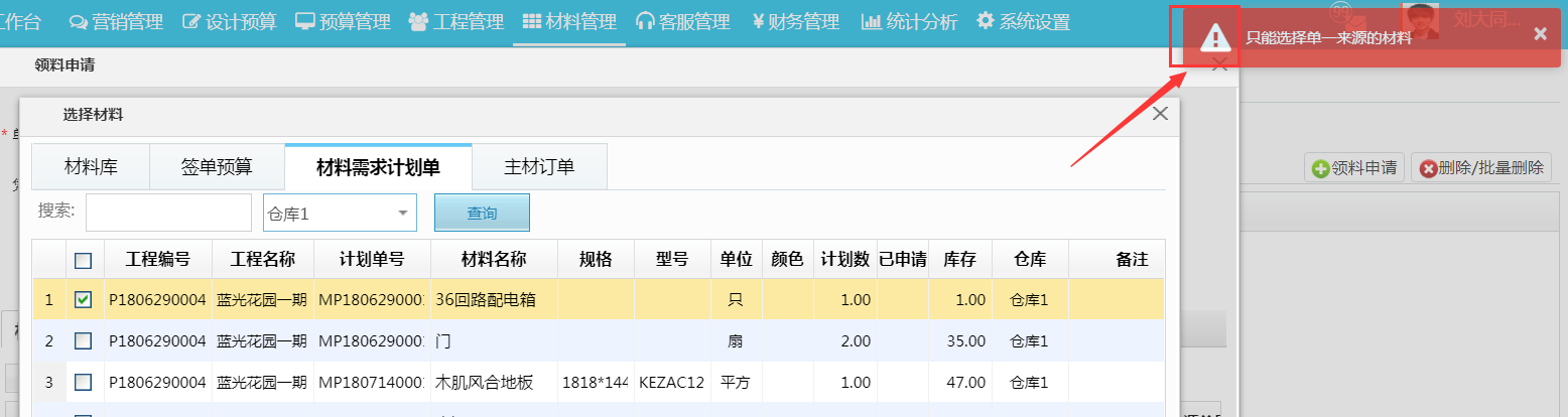 例如:定額庫、簽單預(yù)算、需求計(jì)劃這三種渠道的材料不能將定額庫和簽單預(yù)算中的材料混選。