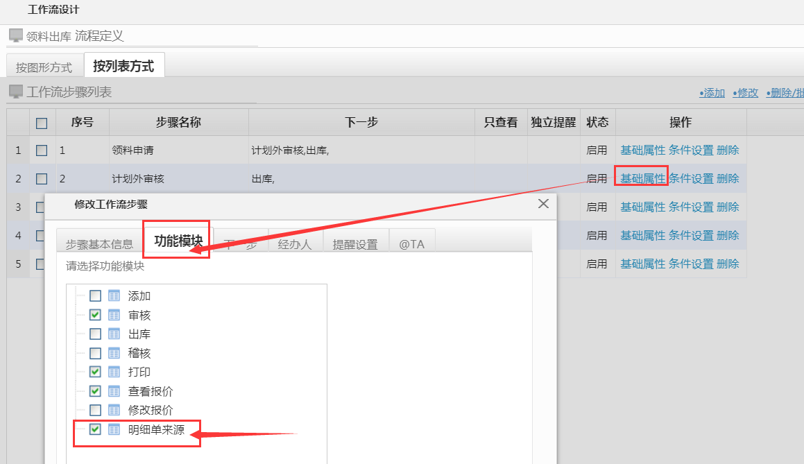 步驟一:首先在工作流程管理中將領(lǐng)料/出庫的工作流完善相關(guān)操作