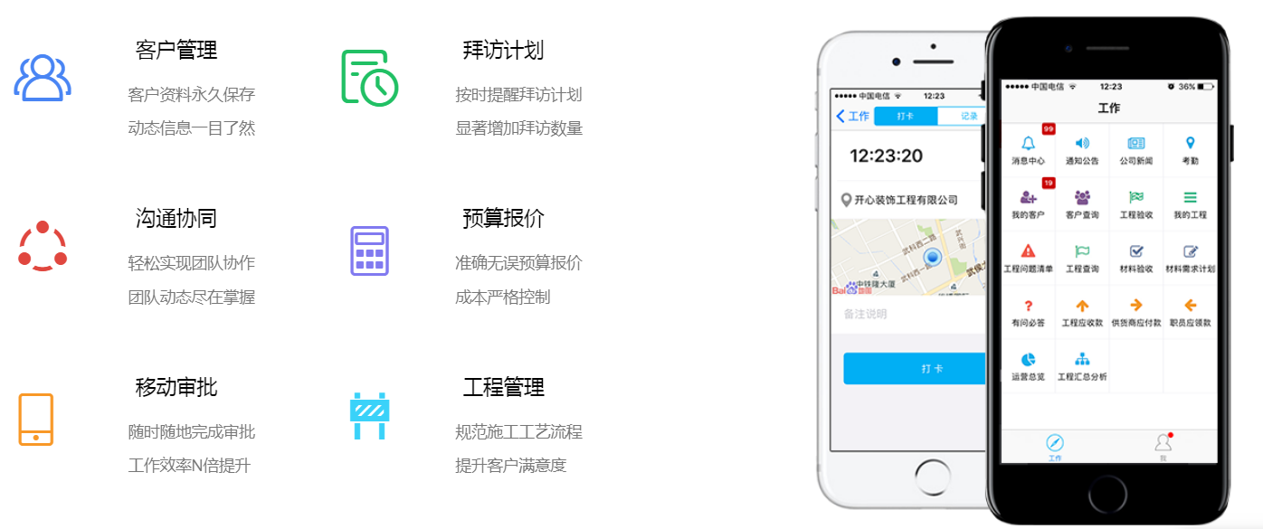 另外一個(gè)好的裝企管理軟件肯定要滿(mǎn)足不同對(duì)象的操作需求,美佳云裝將電腦PC端、手機(jī)APP移動(dòng)辦公、微信客戶(hù)端完美的結(jié)合起來(lái),裝企直接通過(guò)電腦PC端和手機(jī)APP端口完成相關(guān)工作任務(wù)的指派,每個(gè)工作的環(huán)節(jié)系統(tǒng)自動(dòng)銜接,環(huán)環(huán)相扣,人人工作責(zé)任分明,效率在不知不覺(jué)中提高,操作簡(jiǎn)單明了,老板也能時(shí)時(shí)了解員工的工作狀態(tài)及公司運(yùn)營(yíng)情況。微信客戶(hù)端則是提供給裝企對(duì)應(yīng)的客戶(hù)端口,客戶(hù)可通過(guò)微信端了解裝企的公司實(shí)力、案例展示及自己工程的施工進(jìn)度,隨時(shí)通過(guò)微信端和負(fù)責(zé)自己工程的設(shè)計(jì)師、業(yè)務(wù)員、項(xiàng)目經(jīng)理線(xiàn)上溝通,也可通過(guò)微信端一鍵撥打電話(huà)。為客戶(hù)提供一個(gè)優(yōu)質(zhì)的溝通渠道,提高客戶(hù)的滿(mǎn)意度,將裝企好口碑、好服務(wù)傳遞給客戶(hù),從而也提高公司的知名度。