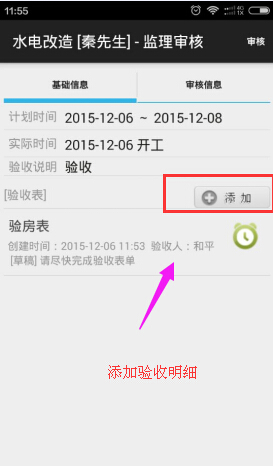 美佳裝飾管理軟件 新增:項目驗收可根據(jù)固定驗收模板驗收,方便監(jiān)理、業(yè)主驗收項目有驗收依據(jù)和標準,目前安卓手機端已經(jīng)上線該功能。驗收時可通過手機端添加驗收模板,參考驗收標準和要求。